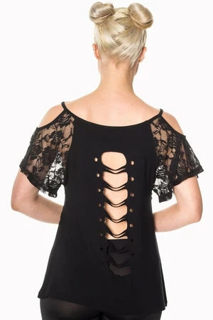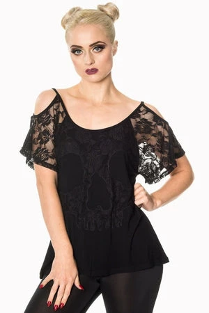 This is an awesome gothic, ladies short sleeve top designed by Banned Apparel, the “aura top”, with a lace skull design and lace sleeves, available in a choice of colours.