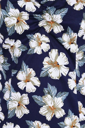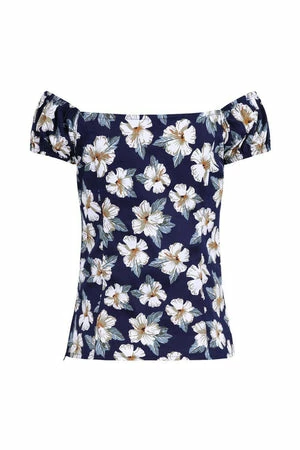 The off-shoulder top has an allover floral print, a boat neckline and a figure accentuating shape.