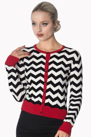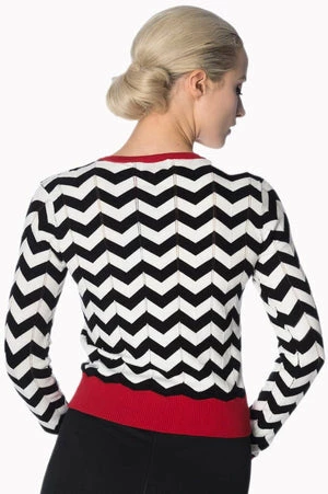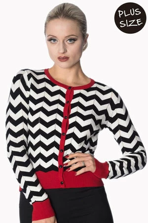 This is a phenomenally stylish Gothic plus size cardigan made by Banned Apparel, with a wavy design. The knitted cardigan has a round neckline, ribbed cuffs, long sleeves and fastens at the front with black glossy buttons.