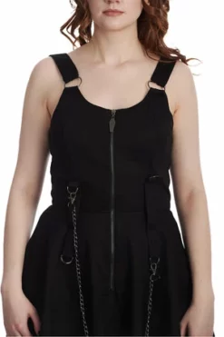 The sleeveless dress has a square neckline, chain detailing, a figure accentuating shape and it fastens at the front with a zipper.