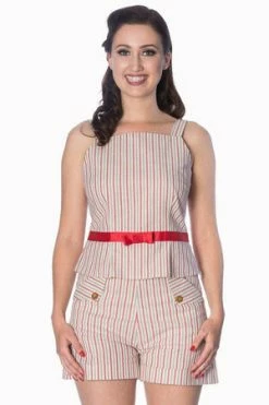 The top has a red and white stripes print, waist belt and bow detail and a figure accentuating fit.