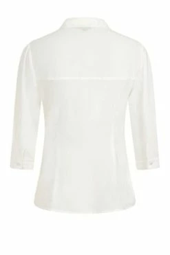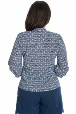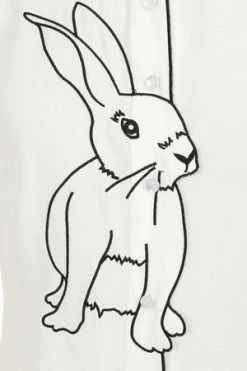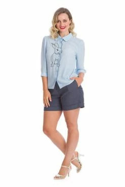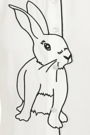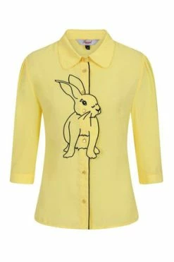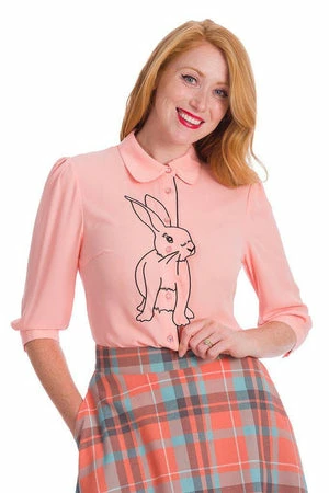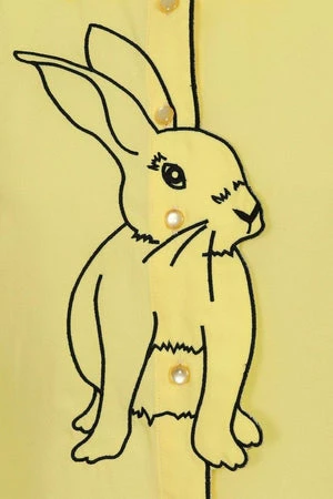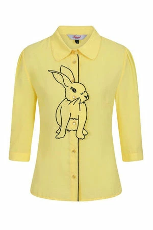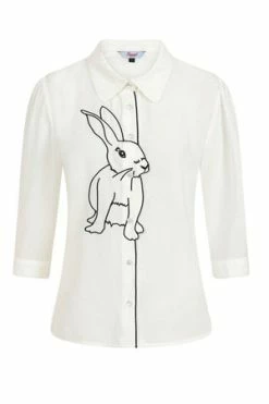 The vintage top has bunny print, V-collared neckline, three quarter length sleeves, front button closure and a figure accentuating fit.