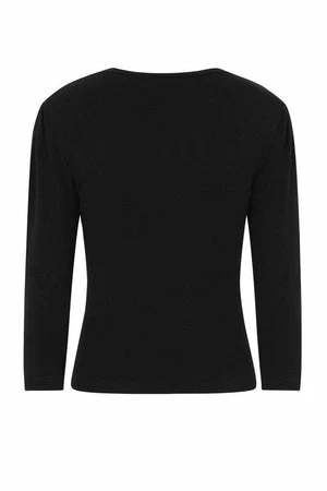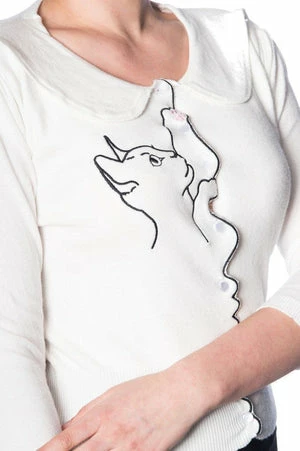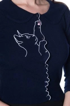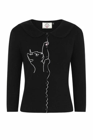 The cardigan has cat collar embroidery, three quarter length sleeves, a round neckline, a figure accentuating fit, ribbed cuffs and hem and it fastens with front contrasting buttons.
