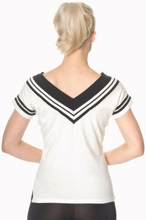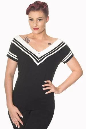 This is an appealing, vintage, ladies short sleeve top style by Banned, the “cedar top”, available in black with white details around the V-neckline and cuffs, or the reverse in white with black details.