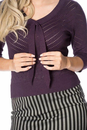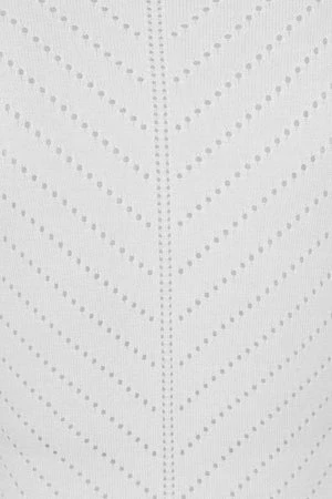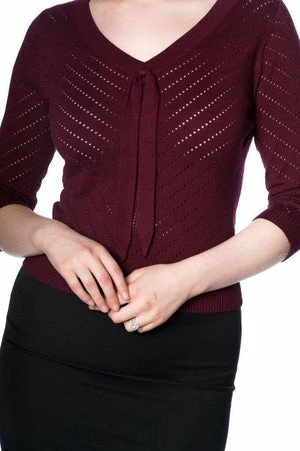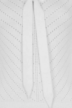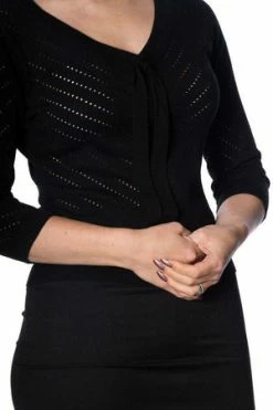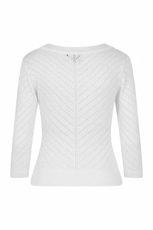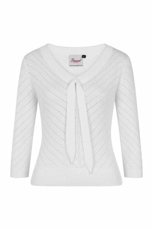 The knitted top has all over eyelet pattern, a V-neckline, three quarter length sleeves, neck bow detail and a figure accentuating shape.