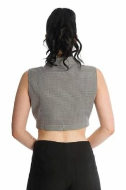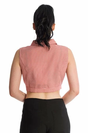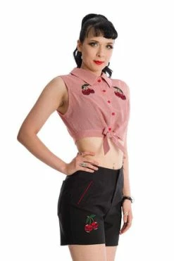 The sleeveless vintage shirt has deadly cherries embroidery, a high neckline, contrast button closure, waist tie detail and a figure accentuating fit.