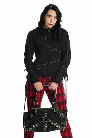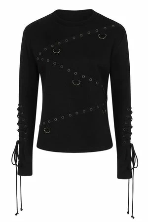 The gothic sweater has d-rings and eyelets detailings, crew neckline, cross tie detailing on sleeves,ribbed cuffs, long sleevesand a figure accentuating shape.