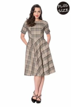 This flared dress has a checkered print, button detailing, a boat neckline, cut-out detail on sleeves, side seam pockets, a flattering fit and it fastens with a zipper at the back.
