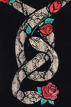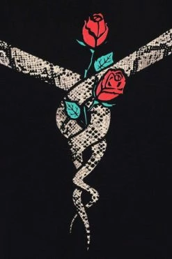 The mini dress has roses and serpent design, a round neckline, short sleeves and a figure accentuating shape.