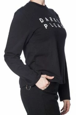 The long sleeve top has darker please caption print, a crew neckline and a figure accentuating fit.