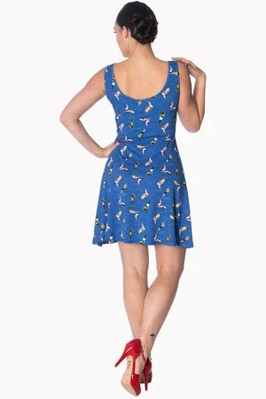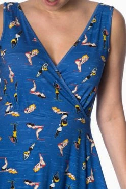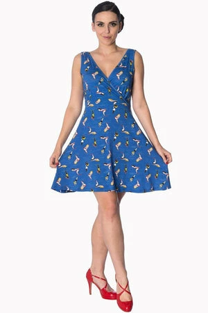 The vintage dress has a deep V-neckline, a mesmerizing dive in themed print and an A-line skirt.