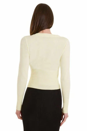 The cardigan has long sleeves, a round neckline, a figure accentuating fit, ribbed cuffs and hem and it fastens with front buttons.