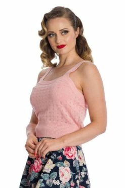 The retro top has pointelle design, a round neckline, straps detail and a figure accentuating fit.