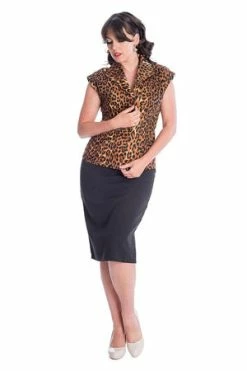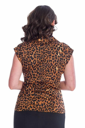 The vintage top has felineprint, a V-neckline, short sleeves, front button closure and a figure hugging shape.