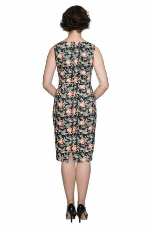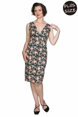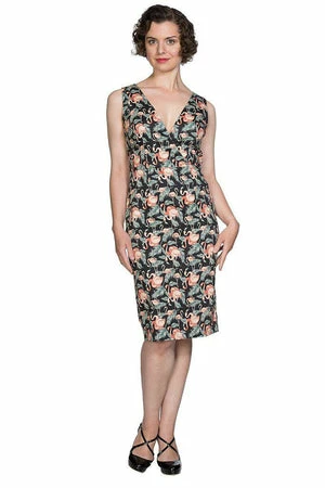 The sleeveless pencil dress has palm leaf and flamingo themed print, a V-neckline, and it fastens with a a hidden back zipper.