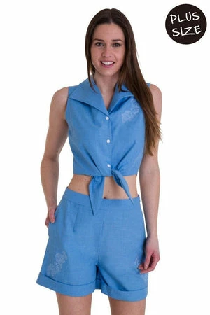 The vintage shirt has flower embroidery, a V-neckline with large collar, with a tie at the waist and fastens with buttons at the front.