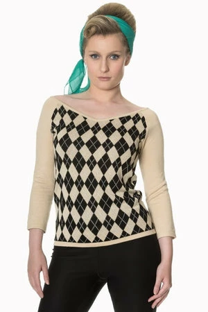 Check out this outstanding, rockabilly, ladies sweater design from Banned Apparel, the “great heights off shoulder knit top”, with an appealing diamonds design, available in various colours.