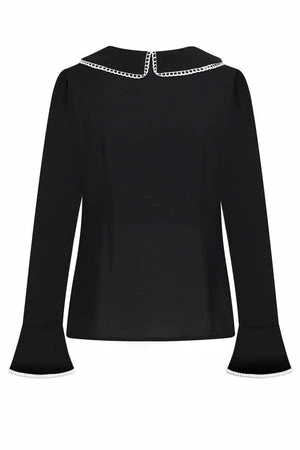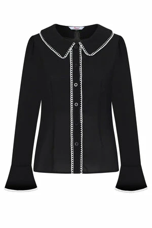 The vintage top has loop detail at the hem of the bell sleeves, peter pan collar, a round neckline and it fastens with buttons at the front.