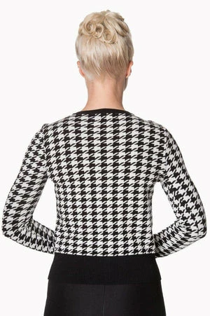 The black and white knitted cardigan has a stunning bold dogtooth pattern, a round neckline, collar bow detailing, ribbed hem and cuffs, full length sleeves and fastens at the front with matching glossy buttons.