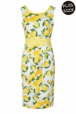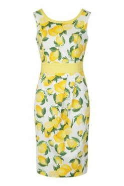 The pencil dress has all over lemon design, a round neckline, waist detailing, a figure accentuating shape and it fastens with a zipper at the back.