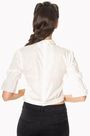 An amazing, retro style, ladies short sleeve cropped top from Banned Apparel, the lotus blouse, in white with a collar, frilly neckline and flared sleeves.