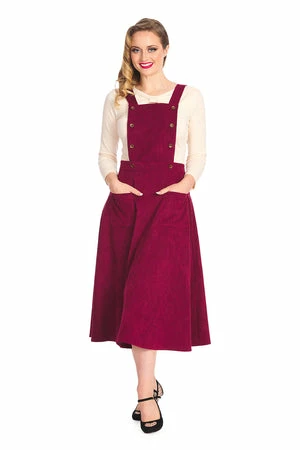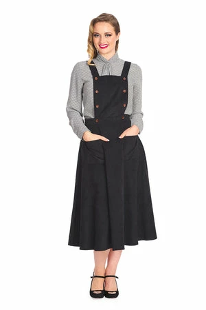 The vintage pinafore dress has a square neckline, button detailing, front pockets, a figure accentuating shape and it fastens at the back with a zipper.