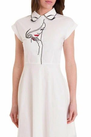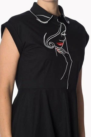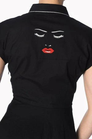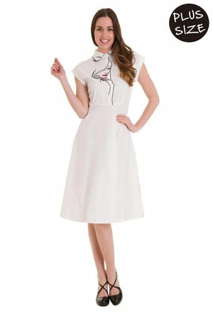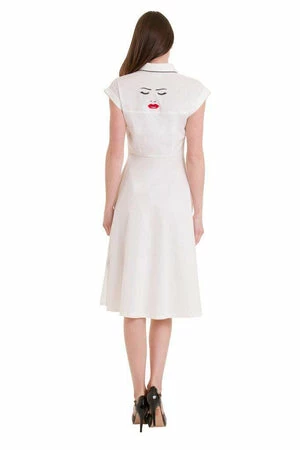 This trendy rockabilly dress from Banned Apparel, with a diva model face design, is quite the statement item. The style is available in white and black.