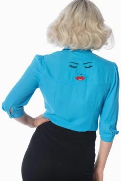 The blouse is embellished with an eye-catching front and back face design with a pop of red lipstick, red nail varnish and eyelash effect on the collar.