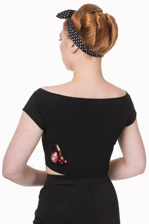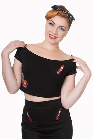 Just look at this delightful, rockabilly, ladies short sleeve top, made by Banned, the “new romantics cropped top”, in black, with embroidered make-up and accessories details.
