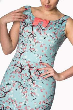 The vintage wiggle dress has an appealing oriental blossom themed print, bow detail, a boat neckline, an pencil skirt and a figure accentuating shape.