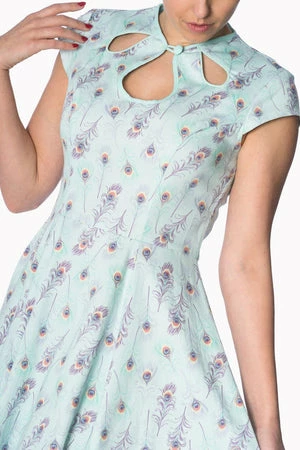 The vintage dress has a sublime peacock feathers themed print, key hole collar, a high neckline, an A-line skirt and a figure accentuating shape.