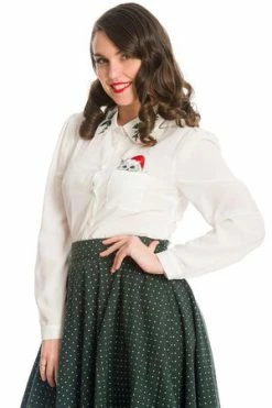 The vintage blouse has xmas cat print, a high neckline, turn down collars, long sleeves, a figure accentuating shape and it fastens at the front with buttons.