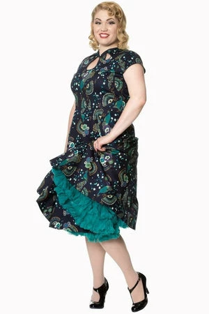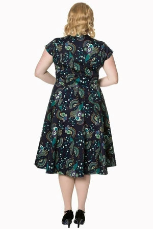 Just look at this stunning, rockabilly plus dress design by Banned, the “proud peacock cut out plus size dress”. This style has a high neckline with keyhole cutouts, short cap sleeves and a flared skirt, it is navy and decorated all over with an eye-catching peacocks print.