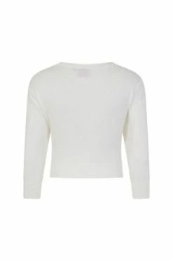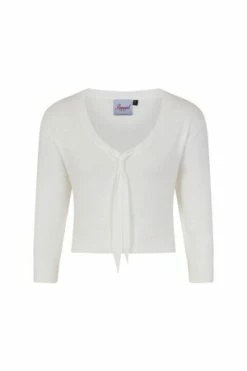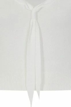 The knitted top has a V-neckline, three quarter length sleeves, bow at the neckline and a figure accentuating fit.