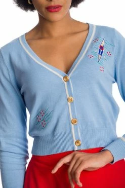 The cardigan has boat embroidery, long sleeves, a crew neckline, a figure accentuating fit, ribbed cuffs and hem and it fastens with front buttons.