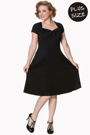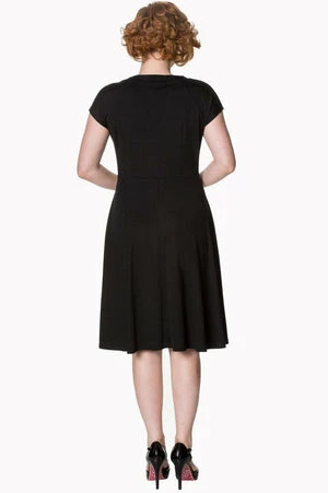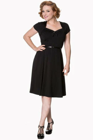 This black dress has a sweetheart neckline with button and bow detail, short sleeves and a figure accentuating shape.