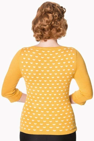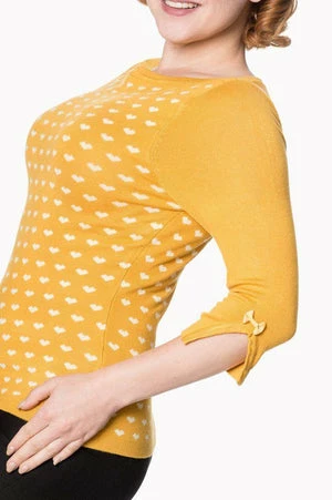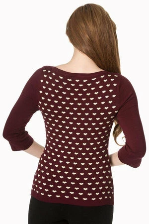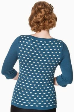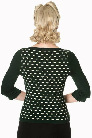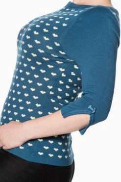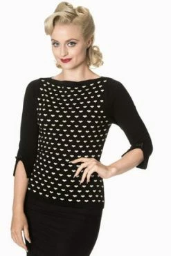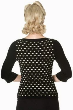 The vintage top has appealing hearts design, a round neckline, three quarter length sleeves and a figure accentuating shape.
