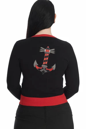 The cardigan has front skull and back anchor embroidery, long sleeves, a crew neckline, a figure accentuating fit, ribbed cuffs and hem and it fastens with front buttons.