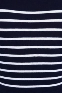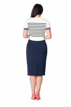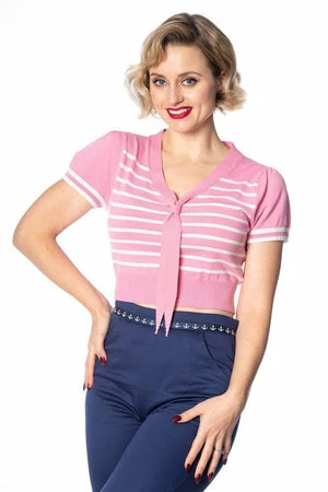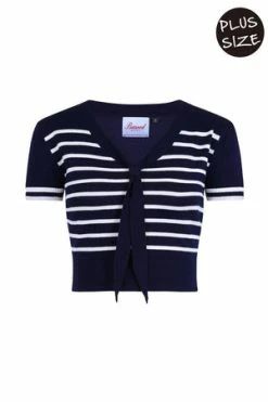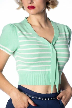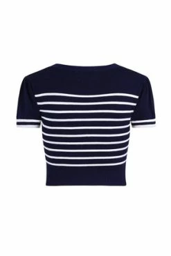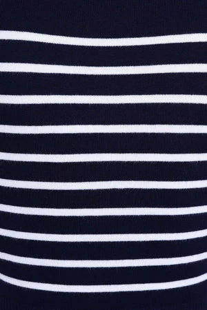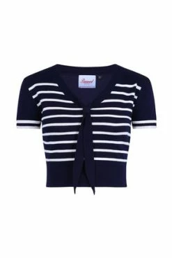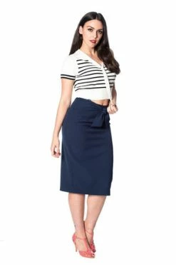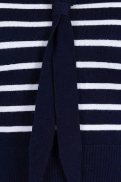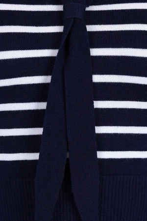 The top has sailor stripes print, bow detail, a V-neckline, neck tie detail and a figure accentuating shape.