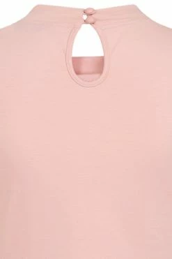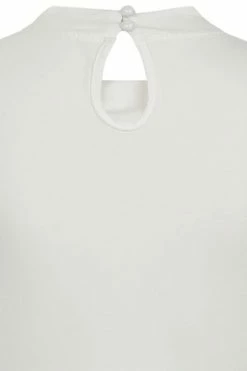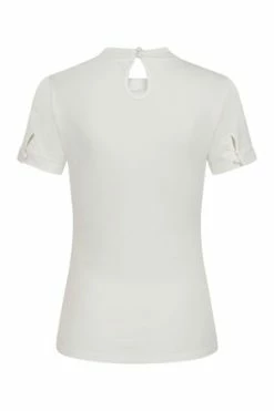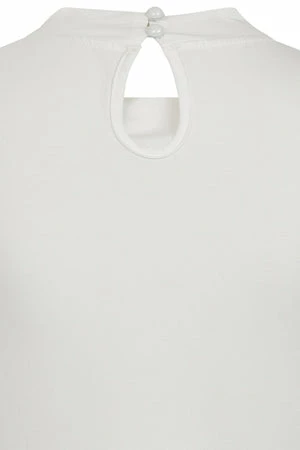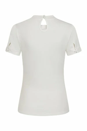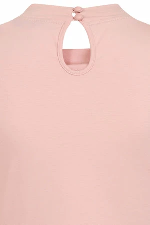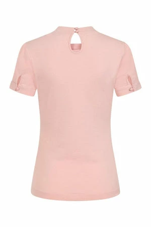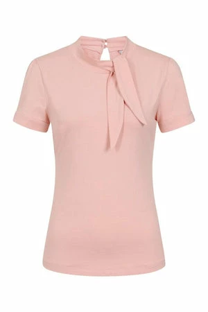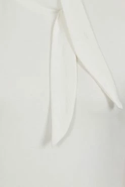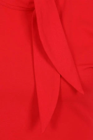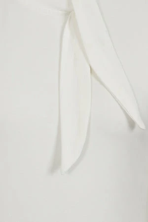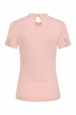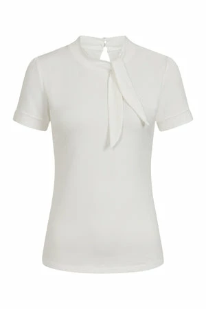 The top has ribbon tie detailing, a crew neckline, back keyhole detail, short sleeves, back button closure and a figure accentuating shape.