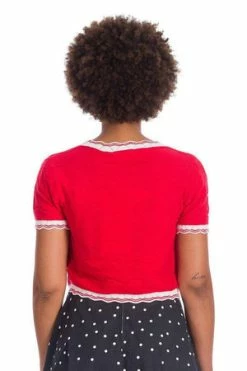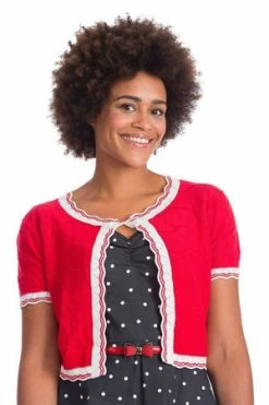 The red cropped bolero has scalloped trim detailing, a round neckline, short sleeves and a short finish.