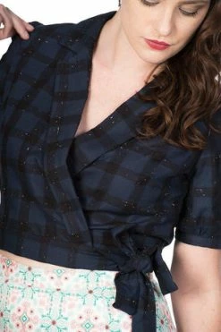 The wrap style blouse has a navy checkered print, a V-neckline, waist tie detailing and a figure accentuating shape.