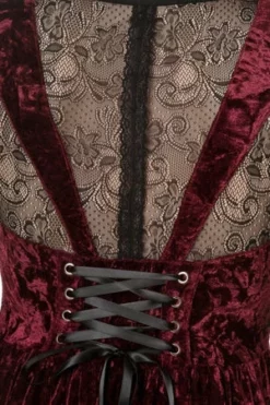A fierce gothic dress made by Banned, the “shadow angel dress”, available in a black or burgundy velvet style material, with floral detailed lace panels at the neckline and back and corset style lacing at the back.