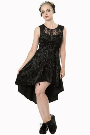 Goth it up in this epic dress by Banned, the skull candy dress. This style is sleeveless in black with a skeleton cameos, crosses and flowers print and has corset style ribbon details at the front and a roses lace panel at the neckline.