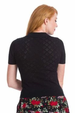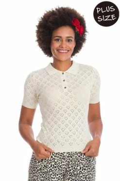 The vintage top has pointelle heart design, high neckline, short sleeves, a figure accentuating fit and it fastens at the front with buttons.