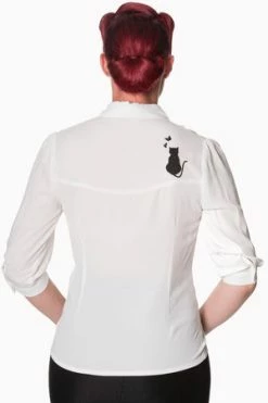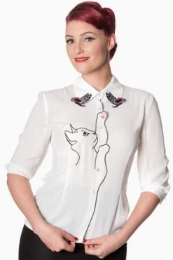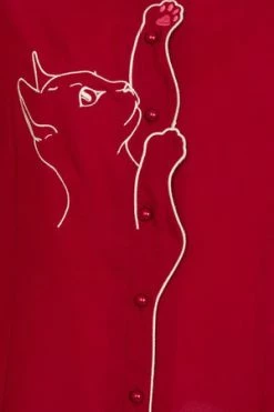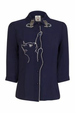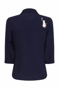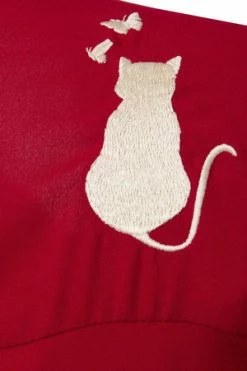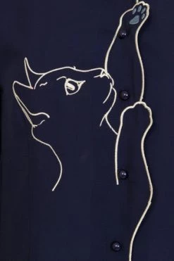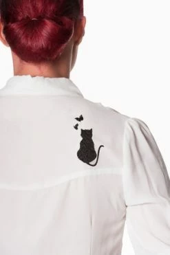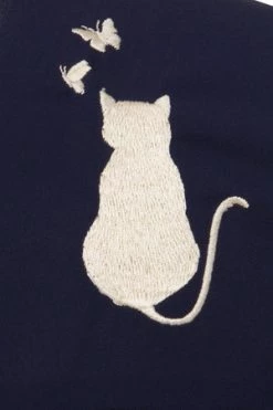 The style features a high neckline, three quarter length sleeves and fastens with buttons at the front. The design features an embroidered front cat crawling up the buttons to chase the butterflies on the collar and an embroidered back cat and butterflies detail.