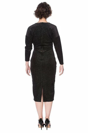 This midi velour dress has shiny polka dots design, a deep V-neckline, three quarter length sleeves, back slit, a flattering fit and it fastens at the back with a zipper.