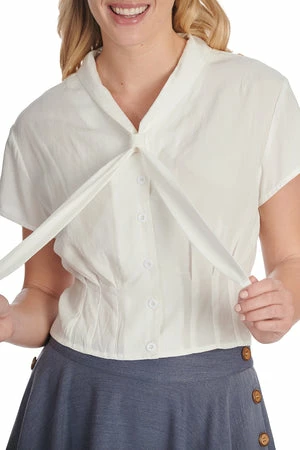The blouse has a V-neckline with collars, front tie detail, a flattering fit and it fastens at the front with buttons.
