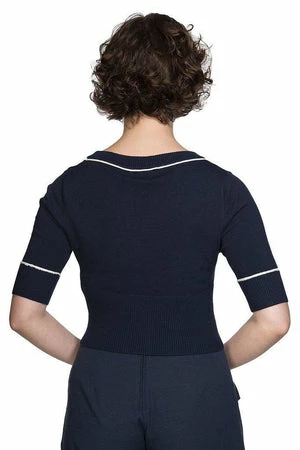 The knitted cardigan has sail ship embroidery, a V-neckline, ribbed cuffs, three quarter length sleeves and it fastens at the front with compass designed buttons.