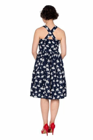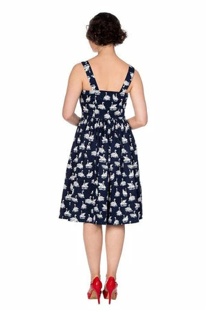 The vintage dress has an allover swan print, pockets, a sweetheart neckline and a figure accentuating shape.
